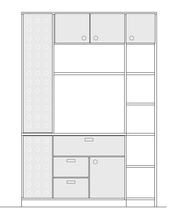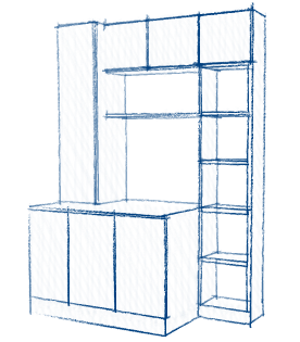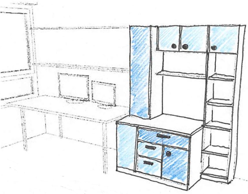 Für dieses mehrteilige Büromöbel wurde der Möbeltyp Kredenz neu interpretiert und adaptiert. Es dient als Stauraum für die technische Ausstattung und Büromaterialien, und beinhaltet ein kleines Bücherregal für Fachliteratur. Die Ablagefläche ist eine Verlängerung des Schreibtisches und bietet Platz für ein Drucker-Scanner-Kopierer-Kombi-Gerät.